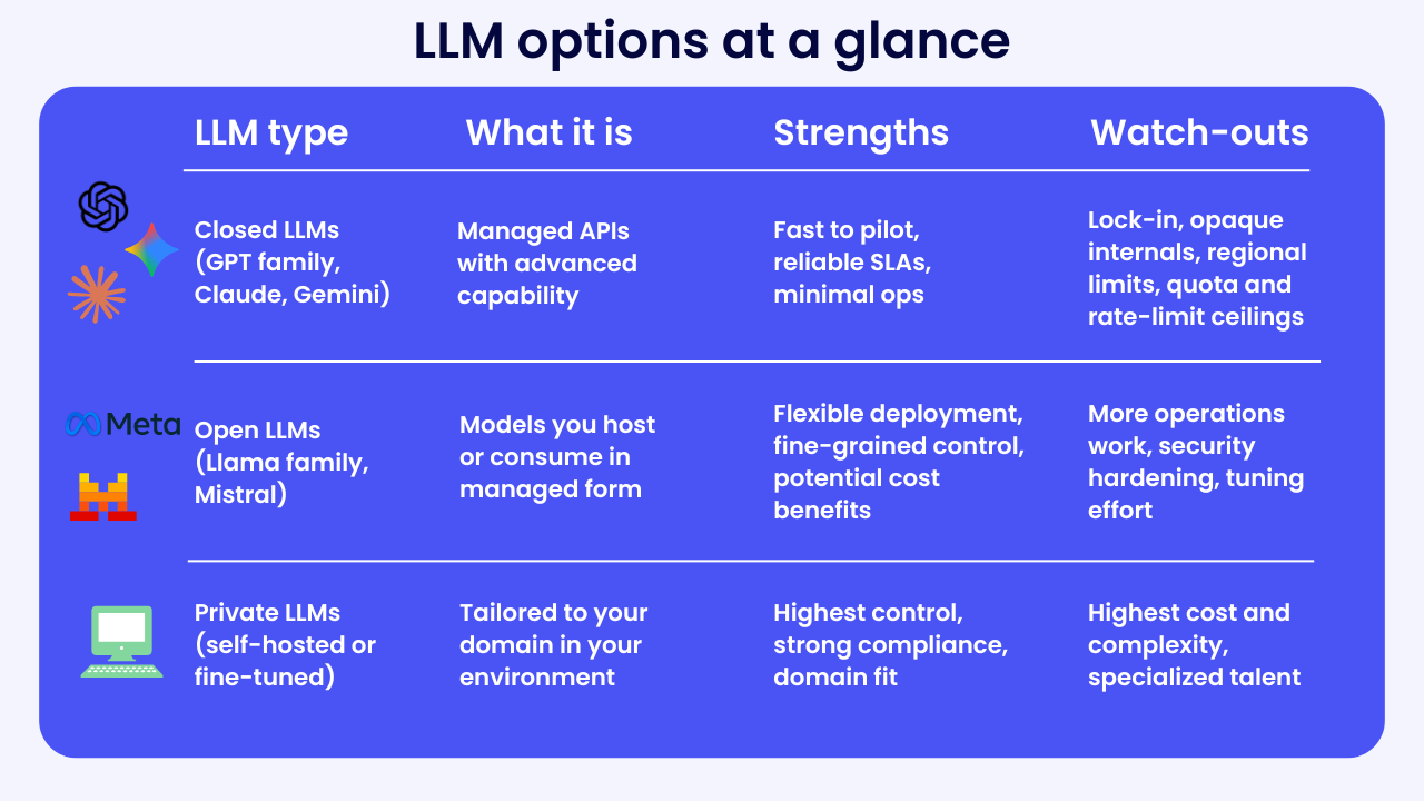 - Closed LLMs such as OpenAI’s GPT family, Anthropic’s Claude, and Google’s Gemini are delivered via API or SaaS. They offer fast access to advanced capabilities but come with lock-in considerations.