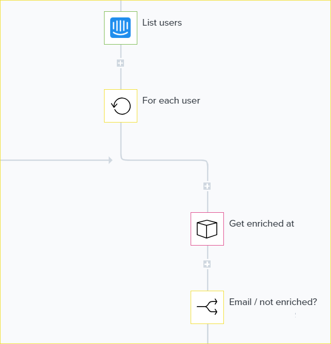 - Loop helper: This loop helper iteratively checks each user that this automated workflow has found in Intercom for updated, enriched info.