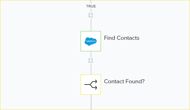 The “false” leg of the previous Boolean takes care of leads that had an email domain we didn’t want to use to match to accounts, so we simply used the Company Name field to try to find a match. The “true” leg runs a search in CRM to see whether the contact exists in Salesforce, using the email domain.
