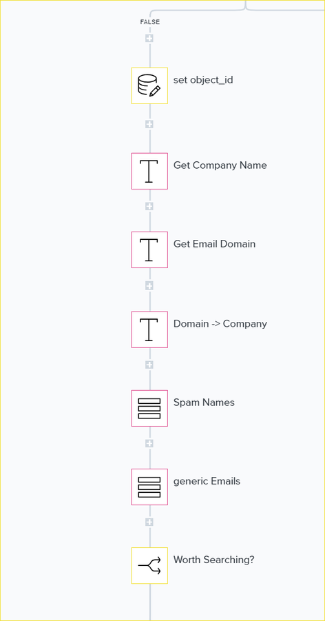 - Boolean If/Then - Worth Searching?: This step compares email domain and company name against the above spam names and generic emails lists, as well as making sure those values are not null, to determine whether these values should be used to search for a matching account.