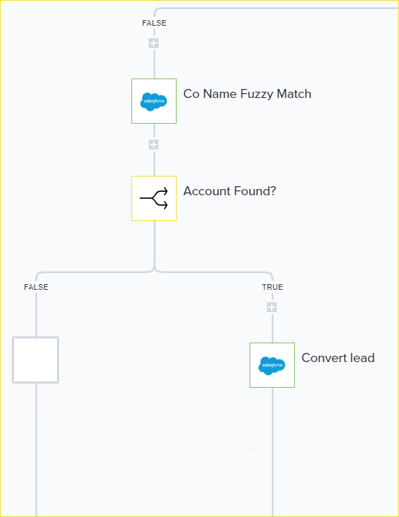 - Salesforce - Convert Lead: If, as the result of the previous Boolean loop, the workflow finds an exact match for the lead’s company name, it then converts the lead within CRM and closes out the process. If it fails to find an exact match (after having previously failed to also find a fuzzy match), it does nothing, having effectively determined that it’s not possible to convert at this time.