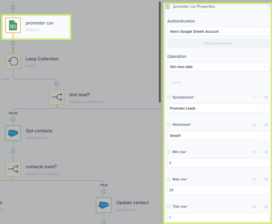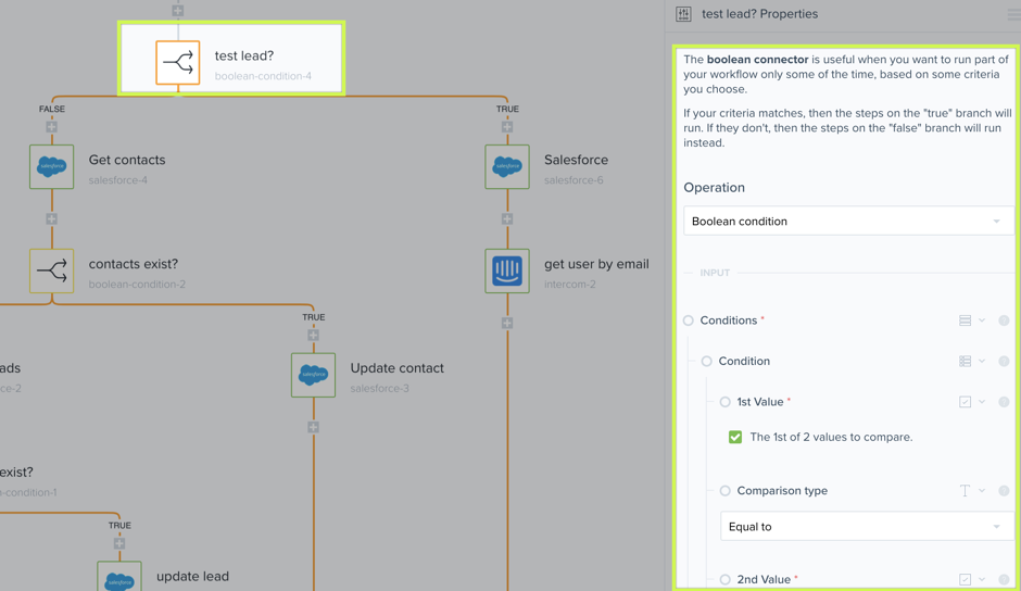 This boolean-condition-4 is an optional step, but a good idea for testing your workflow. With this test, I can spot check data for a particular user, based on an identifier like her email address, is getting passed correctly from Promoter to Salesforce. The Boolean Condition is "if/then" conditional logic.