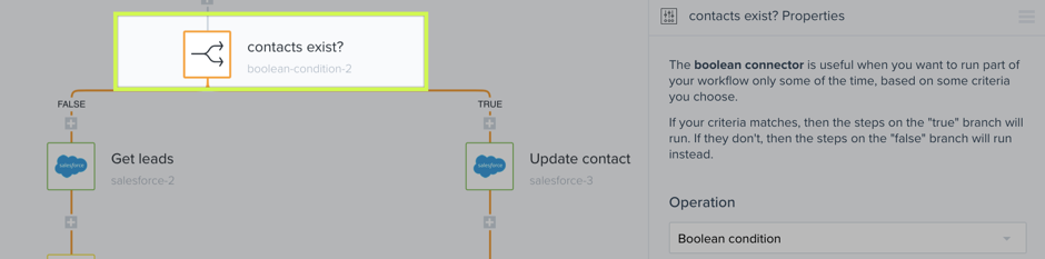 Similar to the "Contacts Exist" step, this boolean-condition-1 step checks to see that the lead exists in Salesforce. By using a boolean to see if the lead is not equal to zero (it exists), then go to the TRUE side of the branch to and execute the next step which is to Update the Lead (salesforce-1). If the lead equals zero (doesn't exist), then go to the FALSE side of the branch and execute the next step.