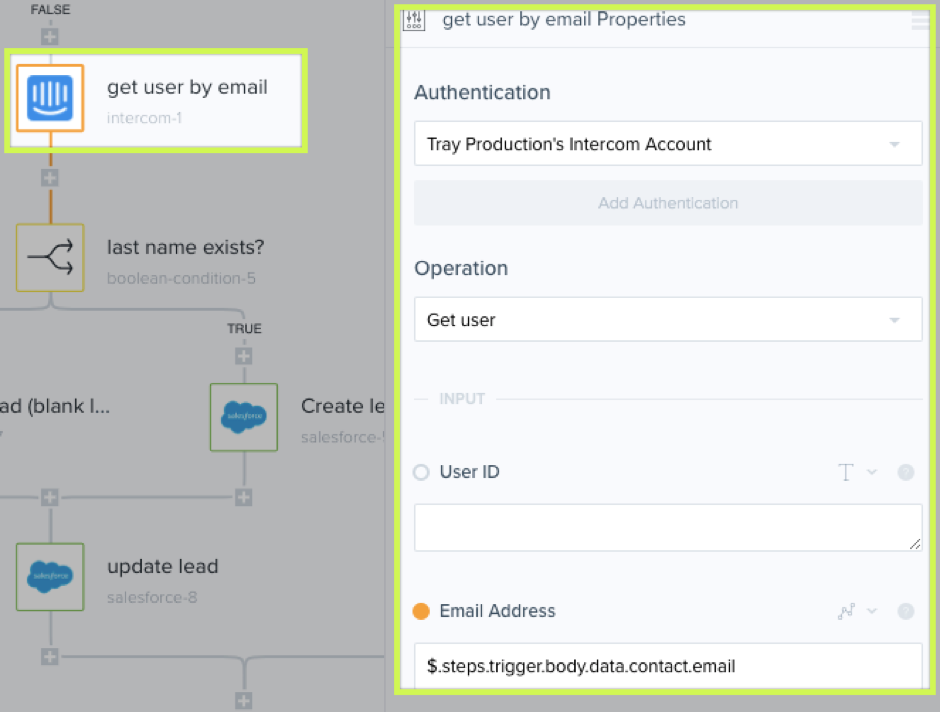 This step, Intercom-1, gets the user by email from our customer chat software (Intercom). In a perfect world, we'd have all Intercom data in Salesforce and visa-verse.
