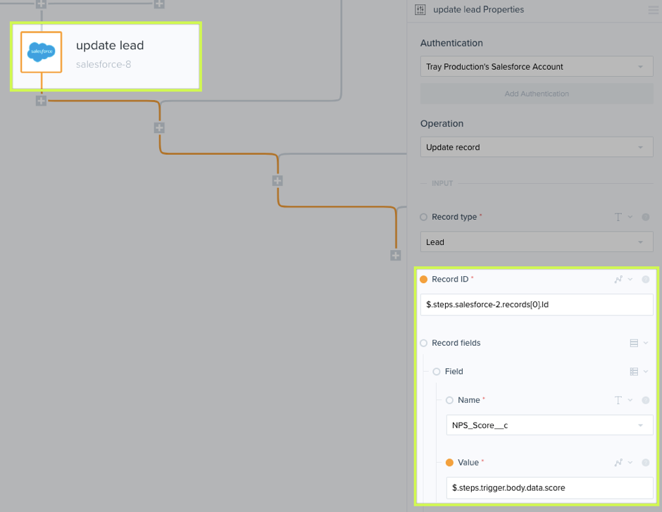 Similar to the “update lead,” here we’re mapping the values from Promoter to the corresponding ones in Salesforce. Once mapped, anytime there is a new survey response Salesforce will get automatically populated.