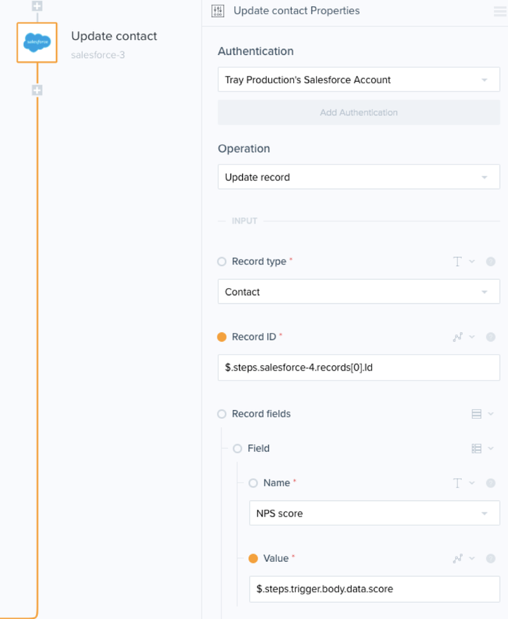 This, folks, is what we’ve been working towards. Now that we know exactly where to put the data in Salesforce, we can now add the data from Promoter.io to Salesforce. Here, we're updating the Salesforce custom field NPS_Score_c (my naming) with the data from Promoter.io webhook. (body.data.score). Similarly, we’re updating the custom field “Cust Sat Comment” with the “body.data.comment” value. Finally, we're adding the body.data.posted_date value from Promoter.io to Salesforce’s “Cust sat response date.”