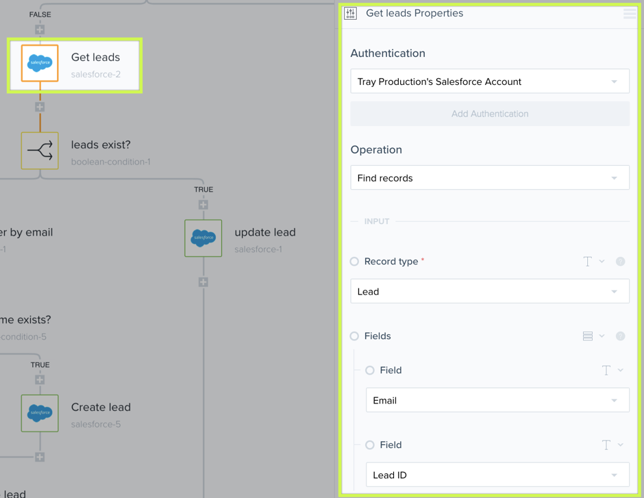 This salesforce-2 step finds the lead record in salesforce based on email address and also grabs the salesforce Lead ID.