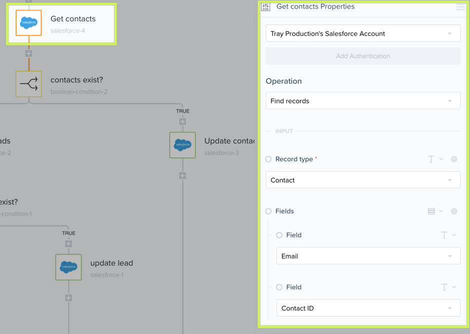 This boolean-condition-2 step is optional. Because we send surveys to people that could exist in our Salesforce instance as a lead, a contact or perhaps don't exist yet in Salesforce, we need first to check to see if we have them in Salesforce and check for the object where they live. This is important so we don't create duplicate data.