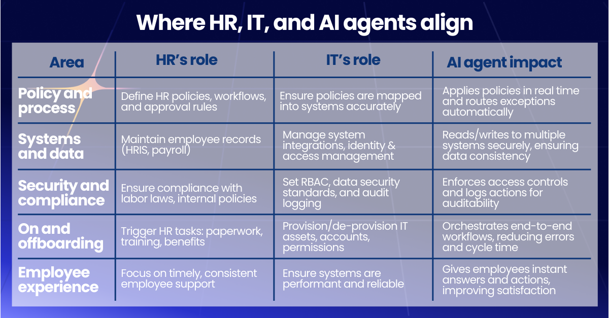 HR and IT must collaborate closely to make AI agents work at scale. Where HR focuses on policy accuracy and employee experience, IT teams must consider governance, integration architecture, and security posture. Without IT’s involvement, agents risk becoming brittle, shadow-IT automations. With IT involved, agents can be deployed with centralized logging, RBAC, and observability, giving leaders confidence that automations are secure, auditable, and scalable.