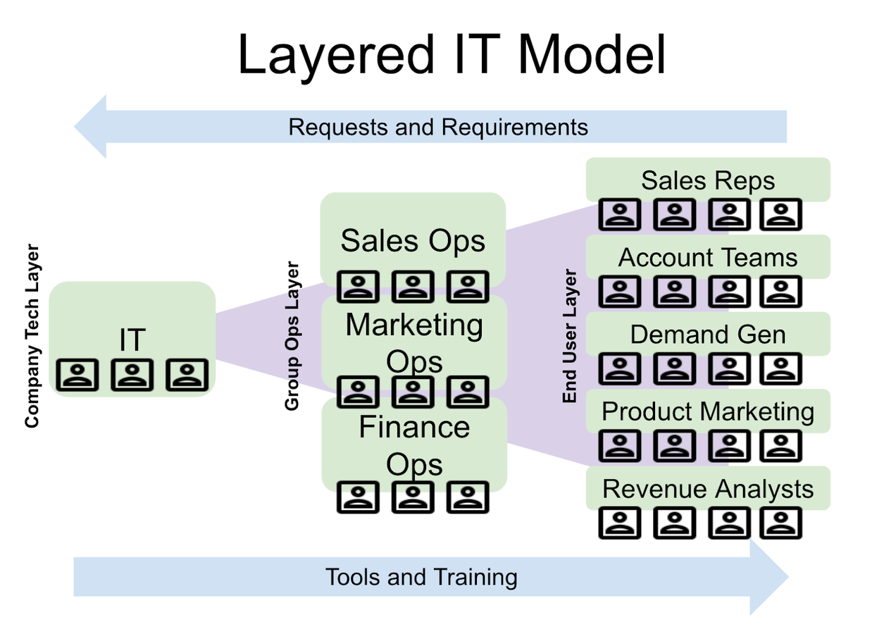 The rapidly ballooning IT backlog is becoming unsustainable. IT is responding by shifting away from being system implementers and maintainers in the traditional, centralized IT model. Rather than acting as a bottleneck for non-technical teams who previously had to wait for IT support, IT teams are evolving into technology enablers that operate a strategic partnership with cross-functional business teams. Many organizations employ a leveled approach to IT - having a company-wide technical group as well as departmental operations (“ops”) groups for department-specific tooling.