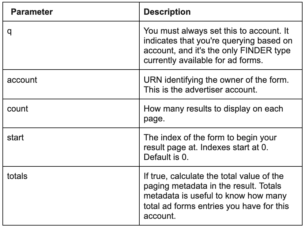 Since an ad account can have a large volume of ad forms, this API supports pagination via the count and start parameters. The totals parameter instructs the downstream service to calculate the total number of existing entries.