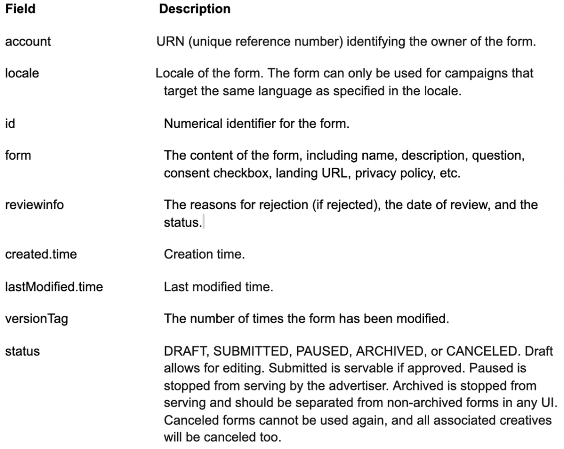 For more information on fetching ad forms, including how to fetch an individual form or multiple forms, see LinkedIn’s API documentation.