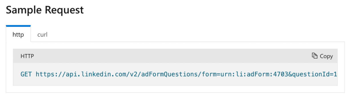 You can request an individual Ad Form Question by passing in an adForm URN in form and the ID in questionID.