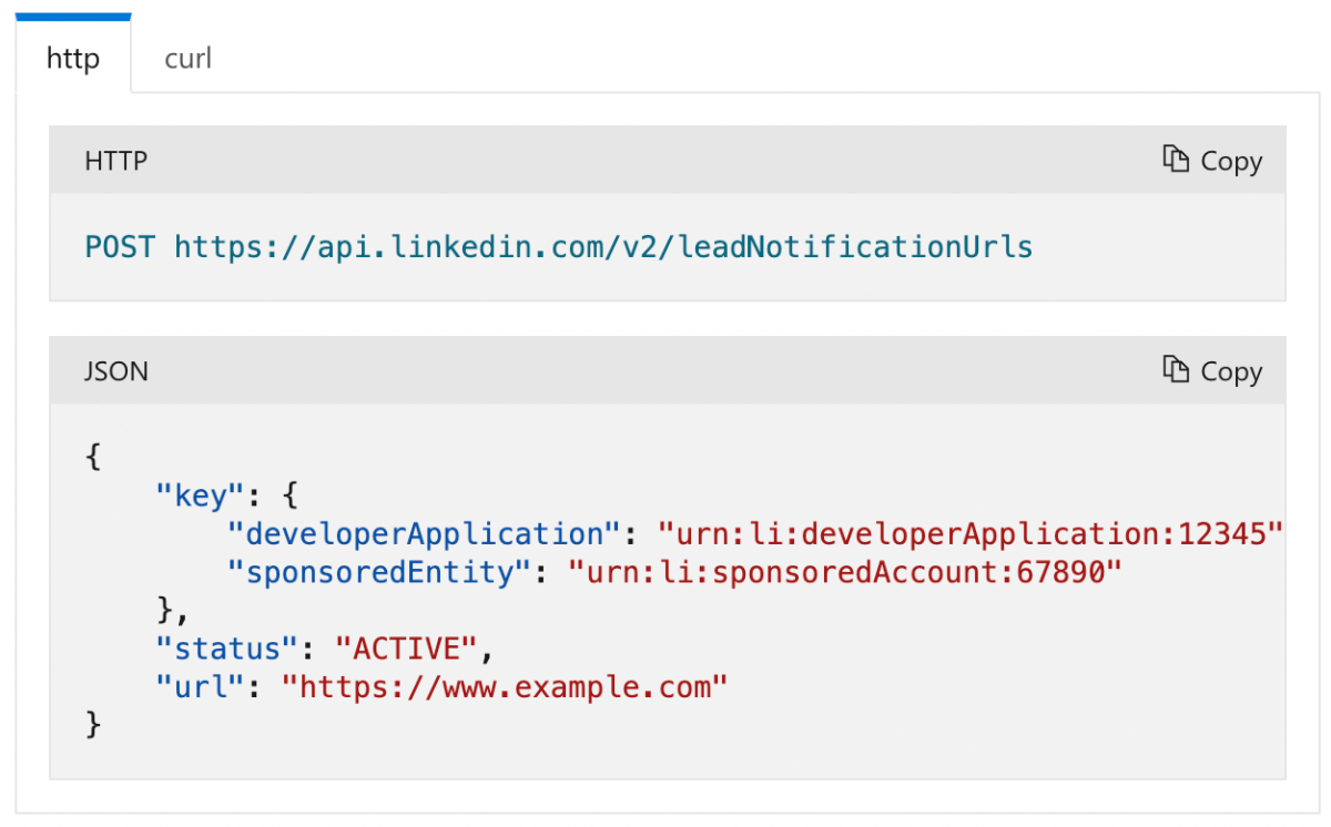 You can register URLs to receive webhook notifications of new leads. LinkedIn only supports HTTPS URLs.