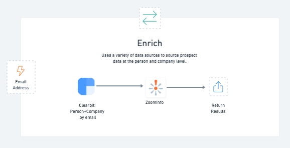What we’re essentially doing here is calling multiple vendor APIs to get person and company data, mapping that data to our standardized object structure, and using a script to mash it all together. The script is pretty nifty, as it allows us to prioritize specific attributes from each vendor. For example, if we like job title data from Clearbit we can say use that first, then if Clearbit doesn’t have something, try to use Zoominfo next.
