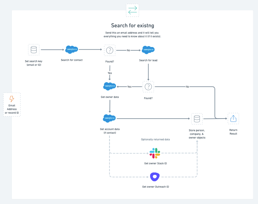 If there's one thing that sales ops teams hate most, it's duplicates. Our strategy to prevent duplicates is built off the workflow we’ll discuss next. All the workflow needs is an email address and it will return with any matching leads or contacts that already exist inside our CRM. Since the pipeline is the only way we create inbound or programmatically sourced leads, this workflow ensures that we won’t create any duplicate records.