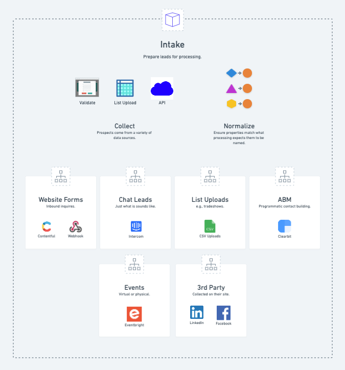 Lead intake processes for the pipeline consist of a "package" of workflows. By package, we simply mean there are multiple workflows that comprise a given job in a process. Our intake processes rely on more than one workflow because leads can come from various sources (such as those shown in the diagram below). We classify each workflow in this package as an “orchestration” flow, as they're not writing data to any system but routing it through to another step in our process. Each workflow "catches" lead data, preps it for processing (using our mapping utility), and "releases" it into the pipeline.
