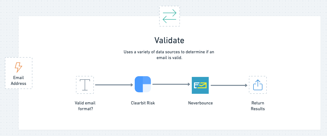 The first "utility" workflow (send it data, it sends data back) we used in our pipeline is our validation workflow. It evaluates a person’s email and returns a variety of data points about it so we can make decisions in the calling workflow, such as: