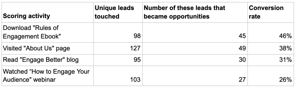 Let’s say you decided that downloading an ebook related to your product is worth a few points. As you score your leads, you should keep track of each of the score elements. You can then check with your sales team to see which leads converted to an opportunity, and then test that against the specific actions each lead took, eventually coming up with a grid like the one below to better determine which actions deserve more or less weight. You may find you were being too generous on the points for a certain action and not generous enough on another.