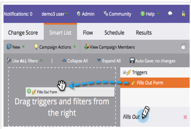 2. Write “Change Score” in the Name field, and then in the” Smart List” tab, drag the filters and triggers you need from the “Triggers” folder on the right into the gray box area on the left: