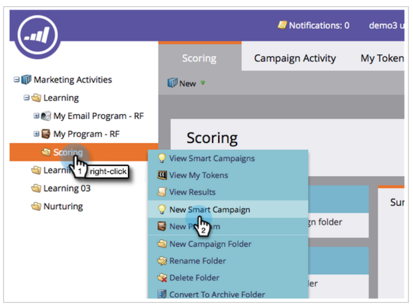 1. Go into Marketing Activities, create a folder called “Scoring” inside the “Learning” folder, right-click the Scoring folder and select “New SmartCampaign”:
