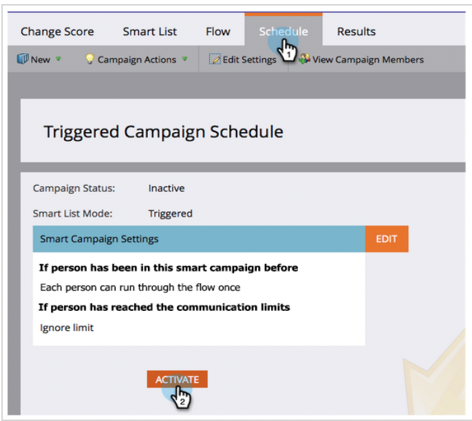 4. Assign a value to the score-change field for this particular action, then go to the “Schedule” tab, check the Smart Campaign Settings and edit them if needed. Then, click “Activate”: