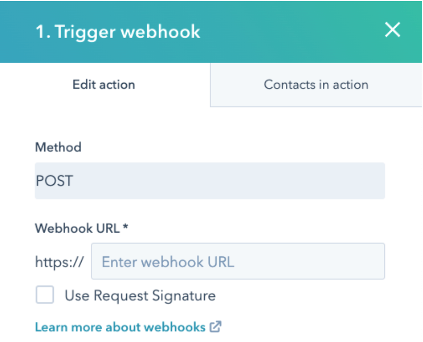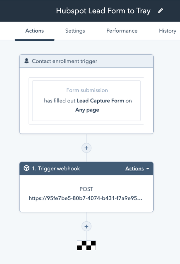 From here, click Set up triggers and click Form Submissions and select the form you wish to use. Selecting a form will open a HubSpot workflow that you will use to call the Tray Platform. Click the + button to add a new step in the HubSpot Workflow. Then search for Webhook and click Trigger webhook in the actions menu. You should see something like this: