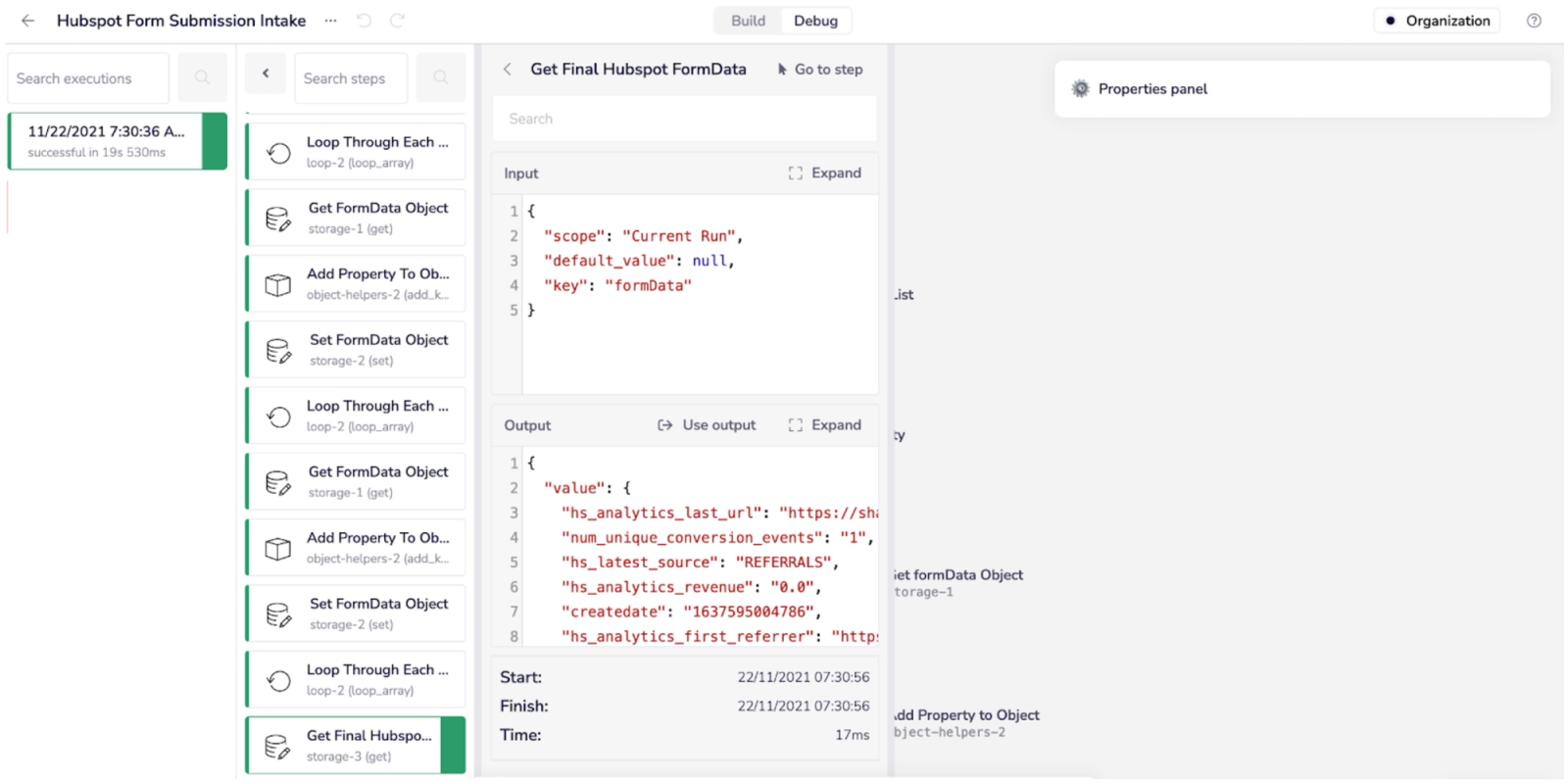 Click the final successful step near the bottom of the log and take a look at the output data. You will see the form fill data, as well as some additional information from HubSpot, that you can send to any downstream system.