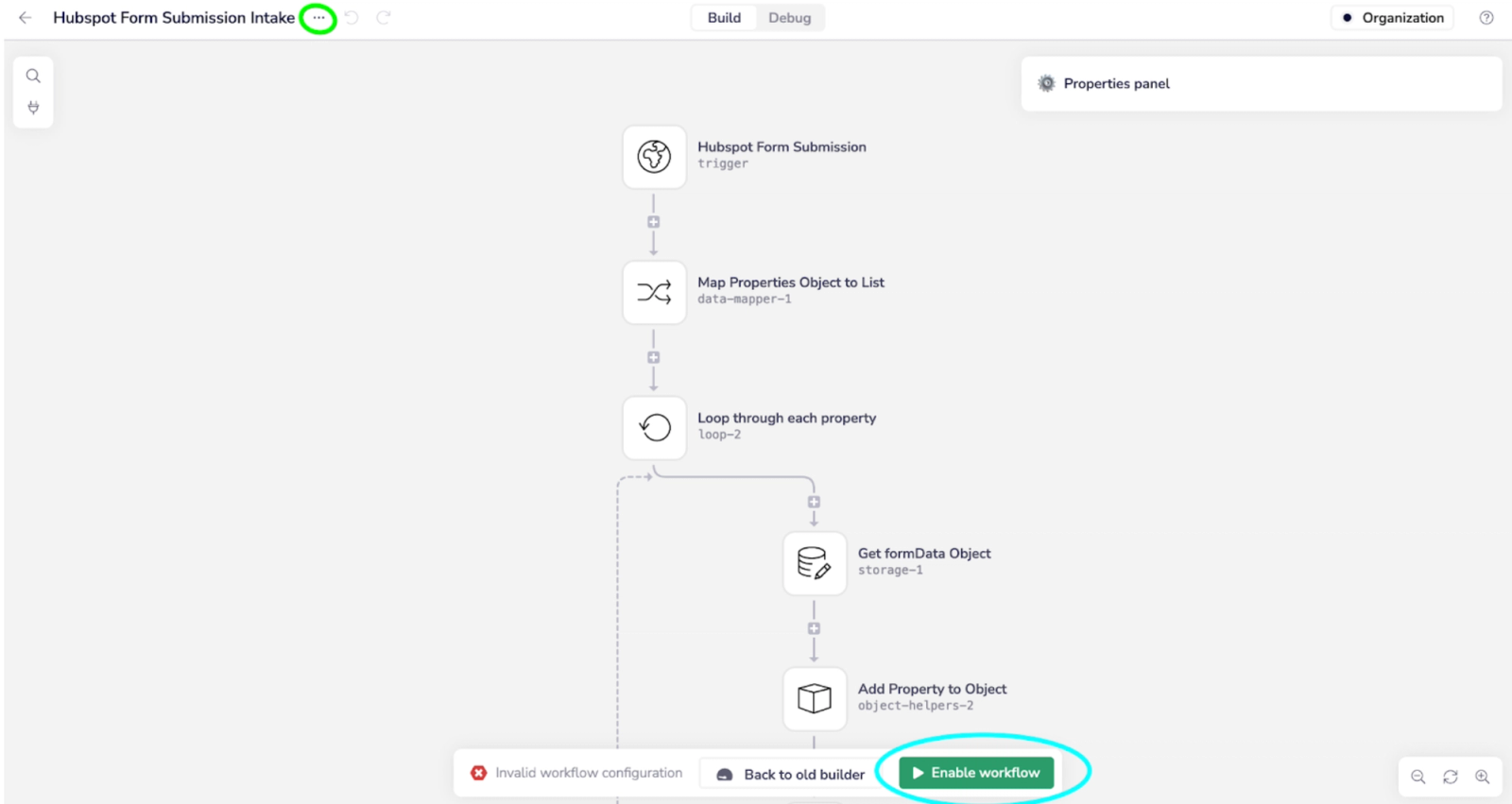 Once you have opened your new workflow, click the green Enable workflow button at the bottom of your screen (circled in light blue in the below image) and then navigate to the Settings at the top left by using the "..." button (highlighted in light green in the below image), and then clicking on Settings. Once you are in Settings, you will see a Workflow public URL field with a URL in it. This is what you are going to take into HubSpot and configure to receive form fill data. Next, copy the URL into your clipboard or a text editor.