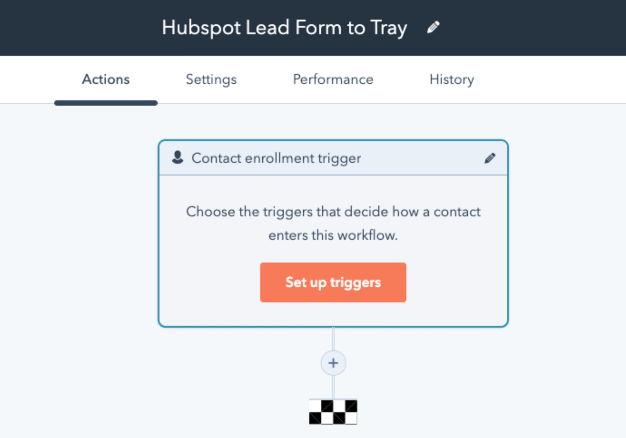 Next, create a new workflow inside of HubSpot to push form fills to Tray. Navigate to the Workflows Section within HubSpot and create a new workflow by clicking Create Workflow > Blank Workflow and then Next. You should now see a screen similar to the below: