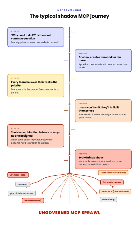 Organizations that spent a decade eliminating shadow IT are now watching a near-identical pattern emerge with MCP. Teams outside IT build their own servers. Developers spin up MCP connections on local machines. Business users grant AI agents administrative access to systems because the alternative is waiting in a queue. Each new connection adds to an invisible inventory of tool access that IT has no way to audit.