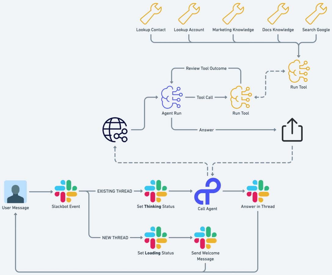 Slack: This is where the user inputs their query or prompt. It's the front-end part of the system that interacts directly with the user. Internally we use Slack (as one of the interfaces), but this can be any application where you can chat via APIs (ie MS Teams).