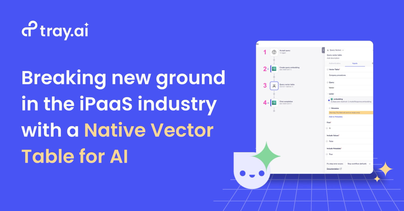 Learn how Tray’s native vector table powers advanced AI capabilities, including real-time data processing and efficient handling of complex data. Build AI applications with greater performance and scalability, all within Tray’s AI-ready iPaaS.