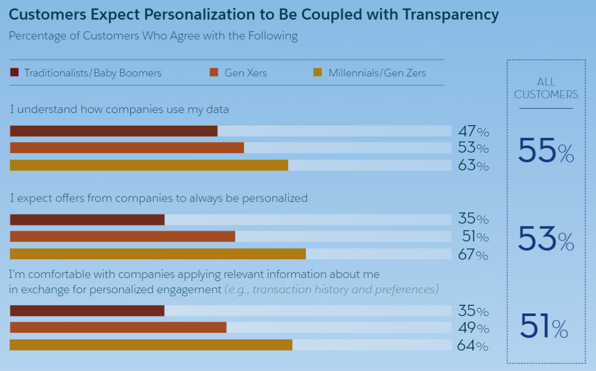 Even though customers are increasingly savvy about online privacy concerns, more than 60% of millennials and Gen Z users - the youngest and savviest users of all - are comfortable trading their details in exchange for a personalized experience (with the personalization definition of special deals and content offered in exchange for transaction history and personal preferences).