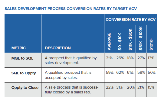 SQL to Opportunity conversion rate (50%+) - Among sales metrics, the SQL-to-opportunity conversion rate is critical in a sales organization. It represents the rate at which SQLs ultimately become sales-qualified opportunities (SQOs) after the account executive team accepts them. SQL to SQO conversion rate isn’t just a factor of how many leads your SDR team is pumping into your funnel, but also something of a quality control metric to assess the SQLs generated. Research suggests that high-performing sales organizations should have a conversion rate of at least 50% to anywhere as high as 62%. A conversion rate that’s significantly lower than 50% may indicate your SDR team isn’t performing quality control and sending too many poor-quality leads to the AE team, which rejects many of them. A conversion rate in excess of 65-70%+ may indicate that an incredible interest in your company’s product, but it may also indicate overeager AE teams accepting too many lower-quality leads as SQOs.