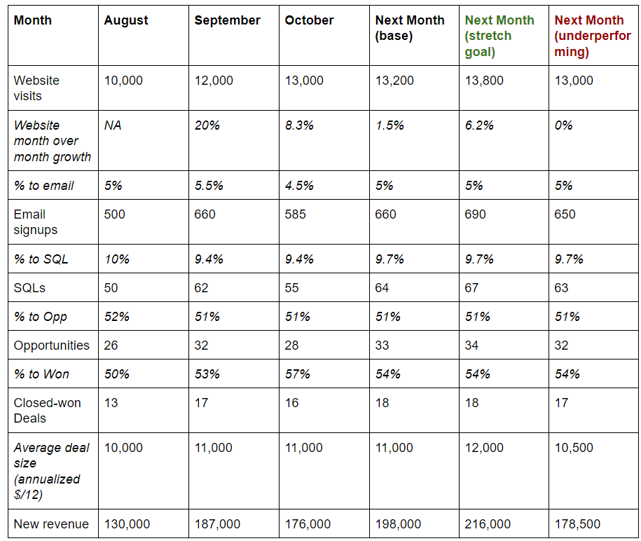 In this example, since we’re tracking the primary conversion events in the funnel (emails, SQLs, opportunities, won deals, average deal size), we can get a quick assessment of where the business is growing and where it’s shrinking. When projecting future sales, we might focus purely on moving the key drivers of sales. In this case, the key topline driver is website visits, though long-term, we might also look for opportunities to improve on our conversion rates.
