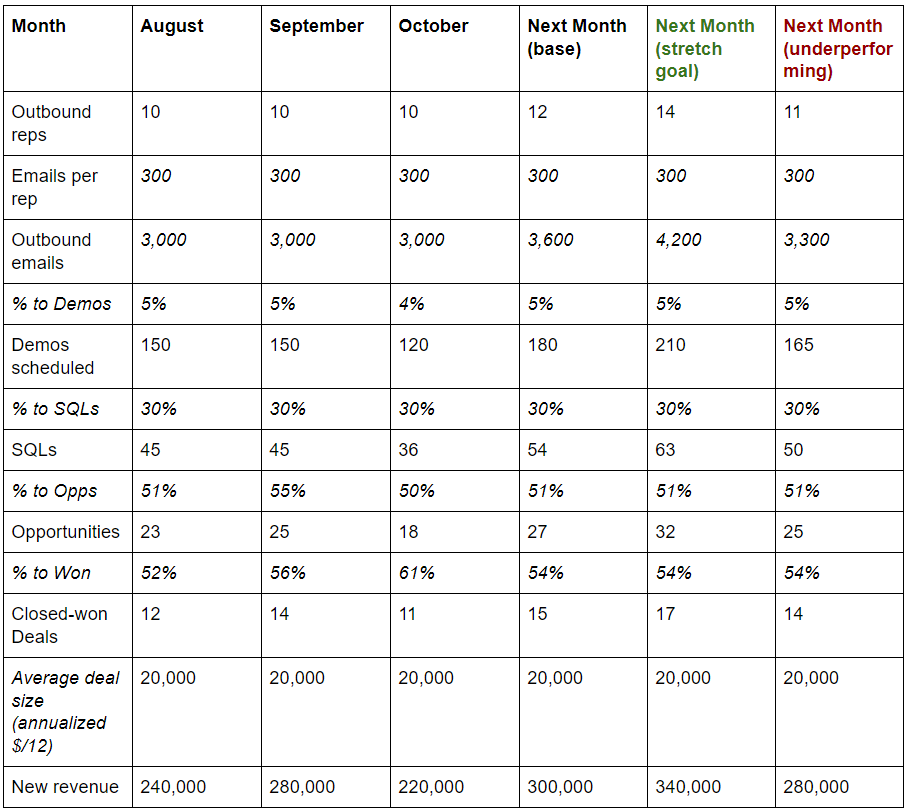 Conversely, here’s what a highly simplified sales projection might look like for a mostly outbound-based organization that focuses on SDR email outreach and is actively hiring more: