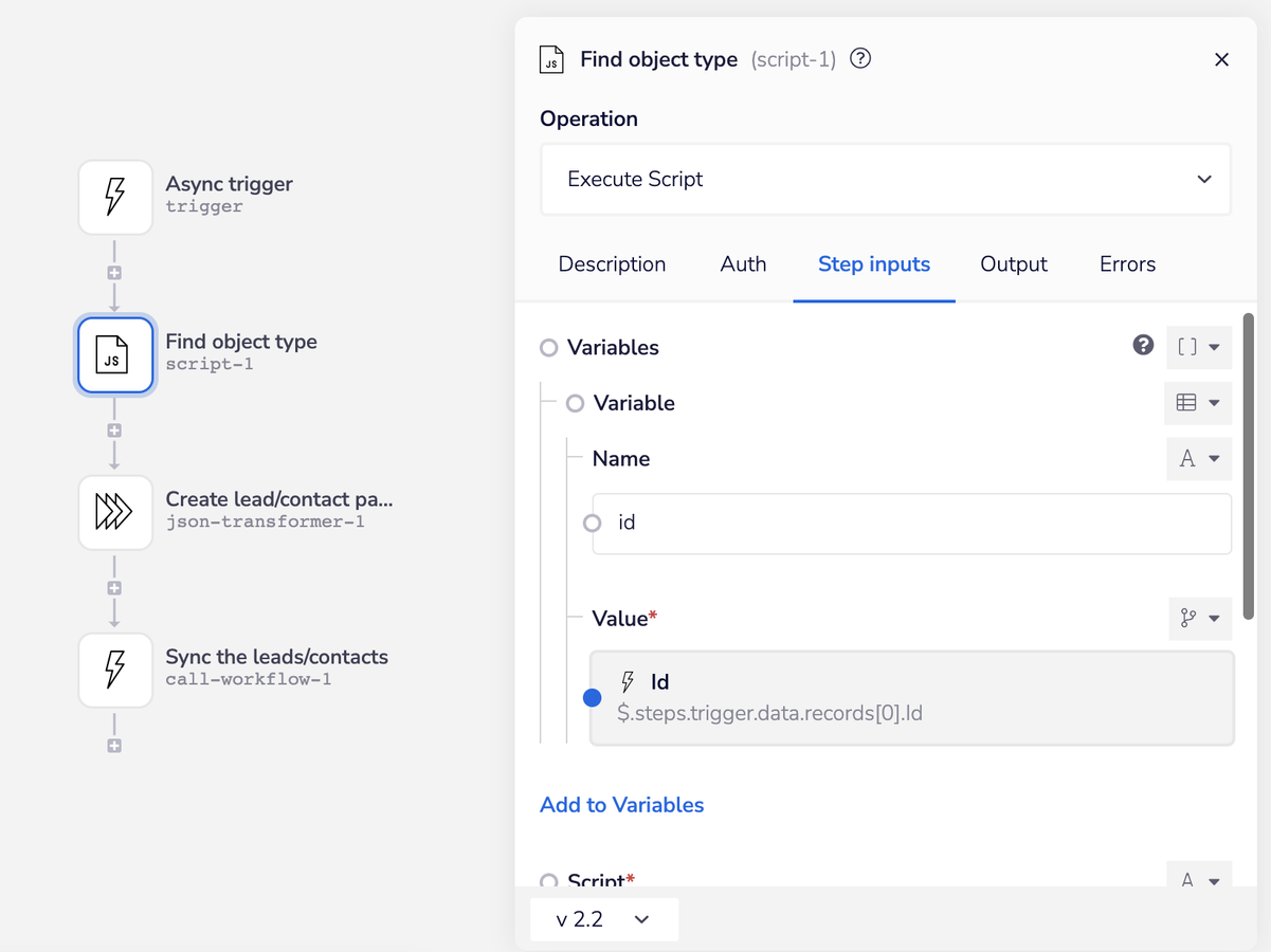In the async callable workflow, the first step is a handy little script helper we use that takes a Salesforce record ID and tells us what type of object it is based on the first 3 digits of the ID. We use this in all sorts of workflows and do it here because we could be backfilling leads or contacts and don't want to have to change this manually each time: