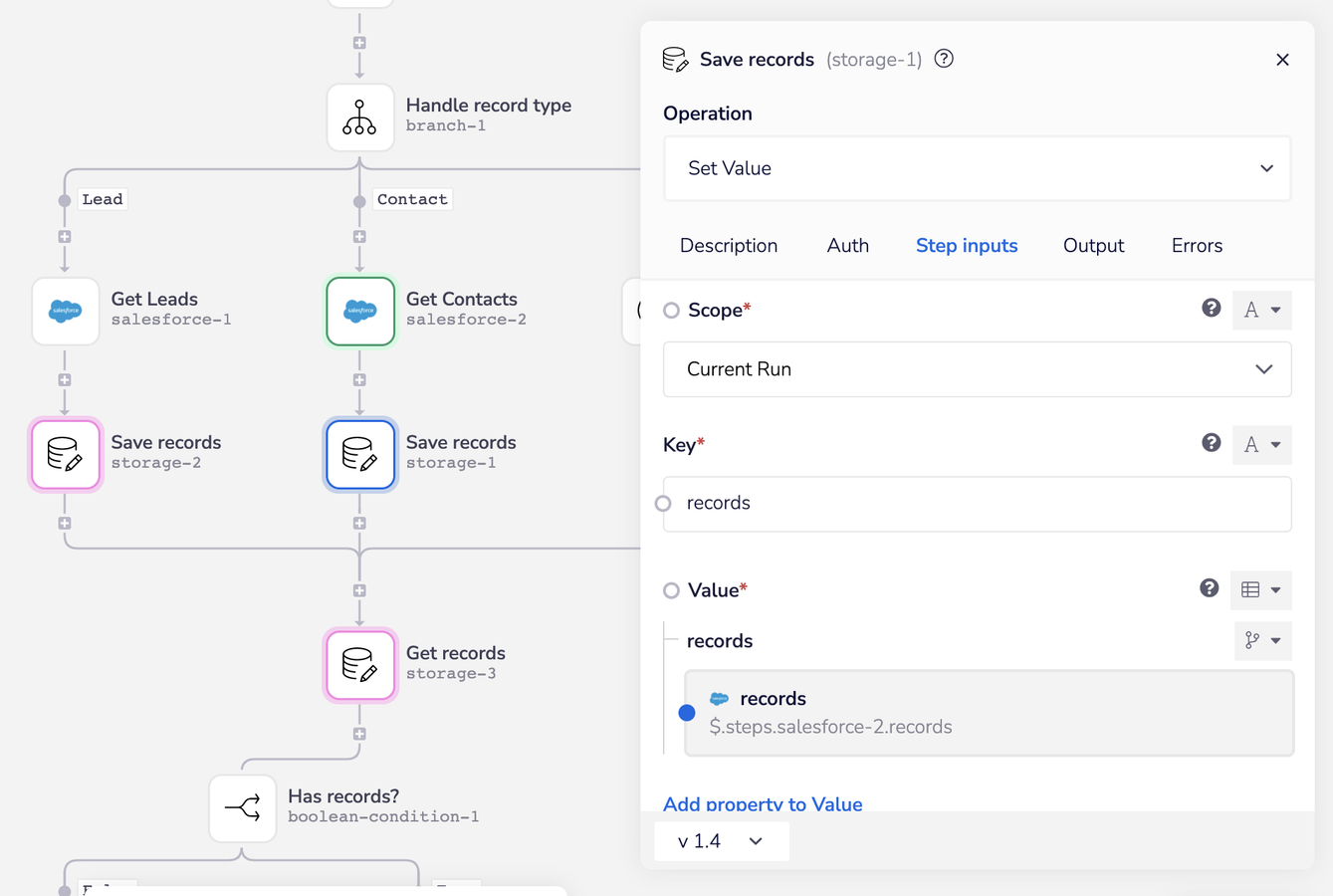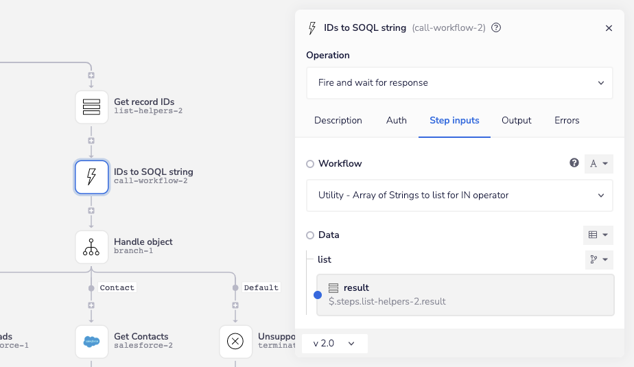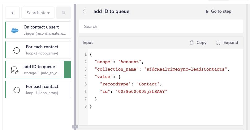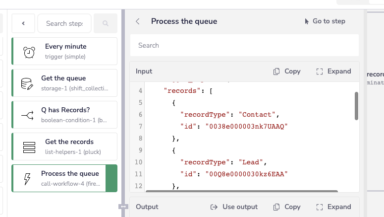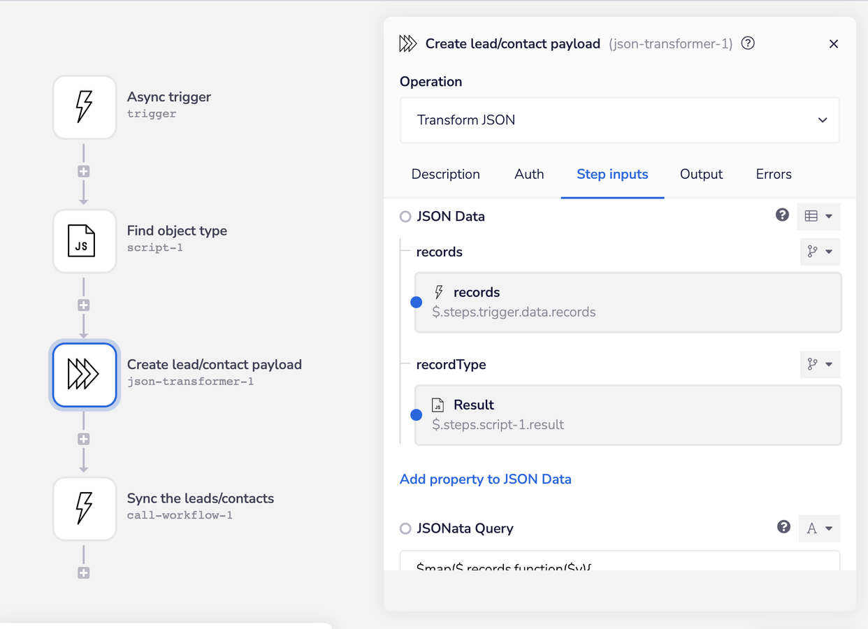 The Create lead/contact payload step uses the JSON transformer helper to quickly structure the provided record IDs before we send them off to the shared processor (here’s a demo of how this transformation works):