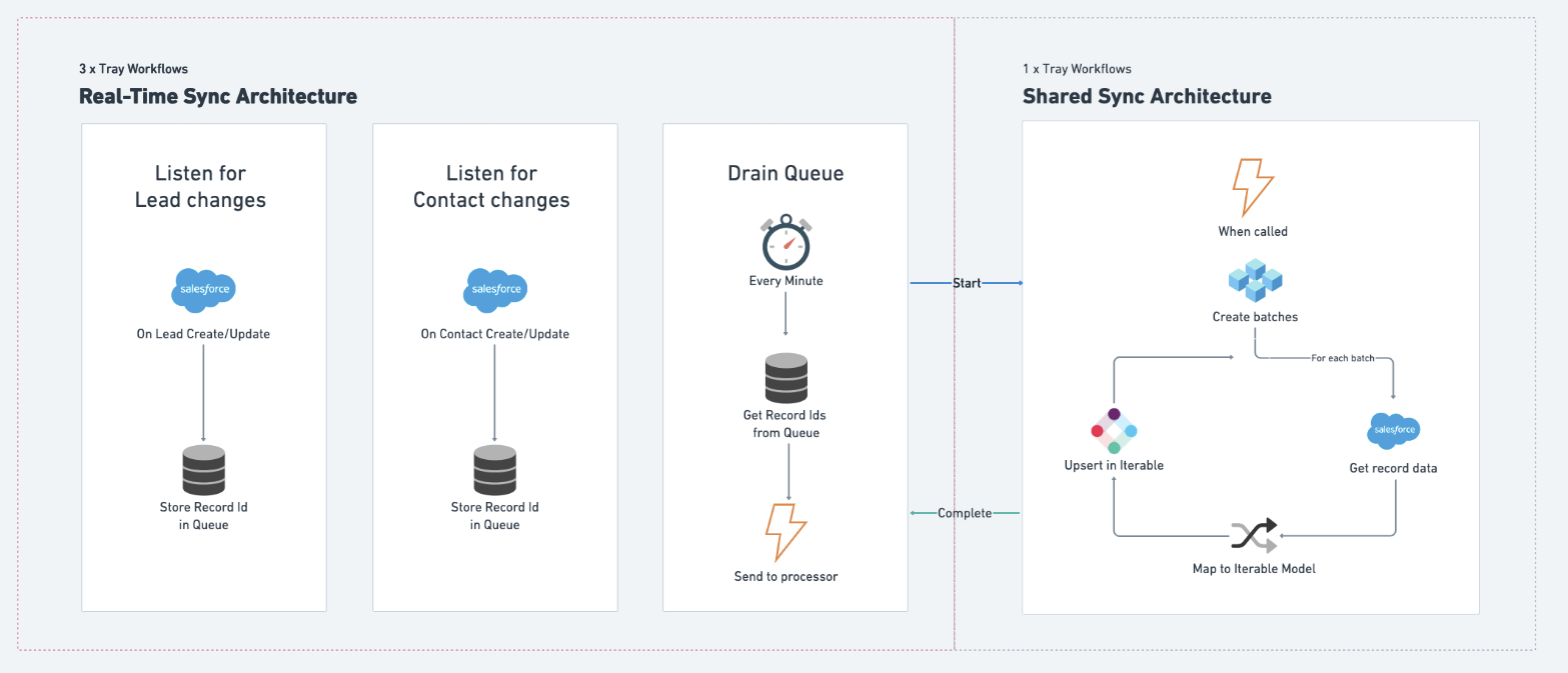 Two of the real-time workflows listen for lead/contact records as they are created/updated in Salesforce; passing them into a queue for processing. The third runs every minute, draining the queue of these records and sending them into the shared processing workflow which does the sync work: