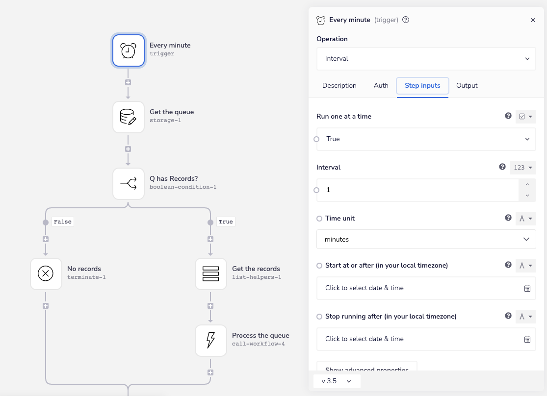 The workflow draining the queue uses a scheduled trigger with the Interval operation set to run every minute:
