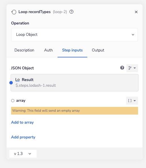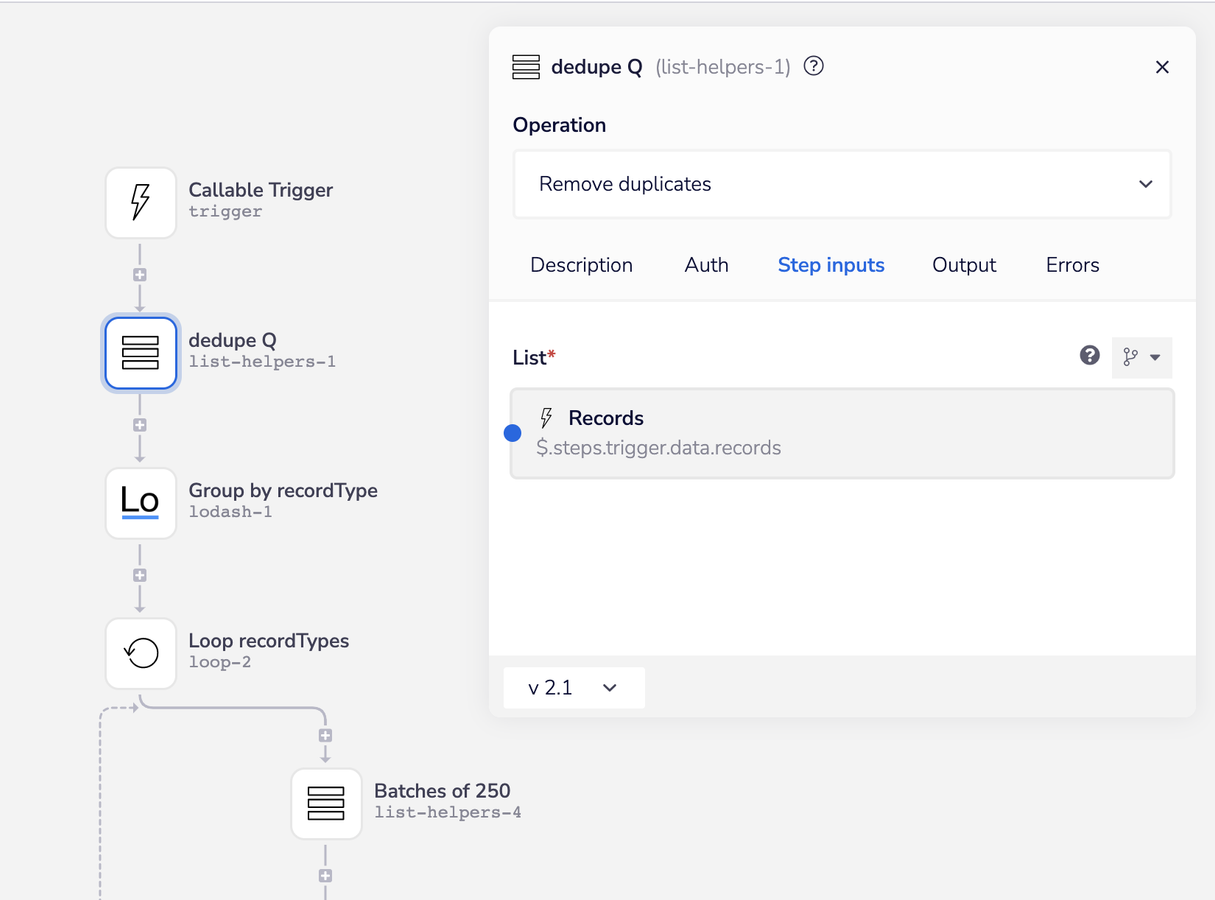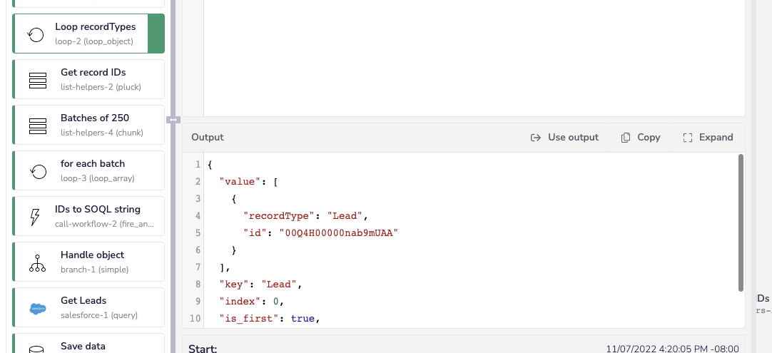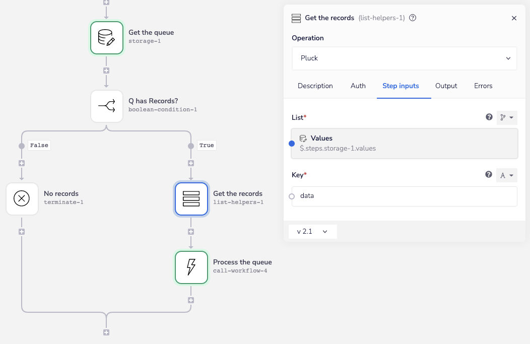 This is the reason for the additional Get the records list helper, which uses the Pluck operation to strip out that extra metadata before we pass the records list to the shared processing workflow: