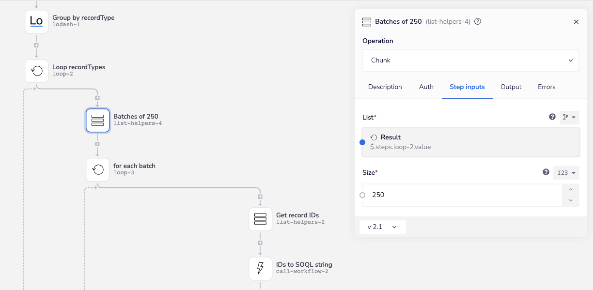 Since we have a distinct set of record id’s for each record type, we can go ahead and create batches using the list helper’s Chunk operation (btw, Chunk is 100% the best character in Goonies):