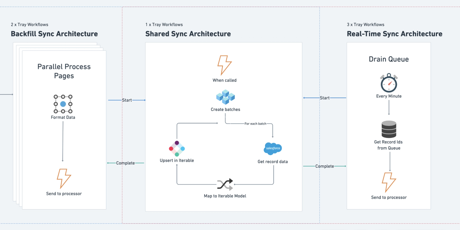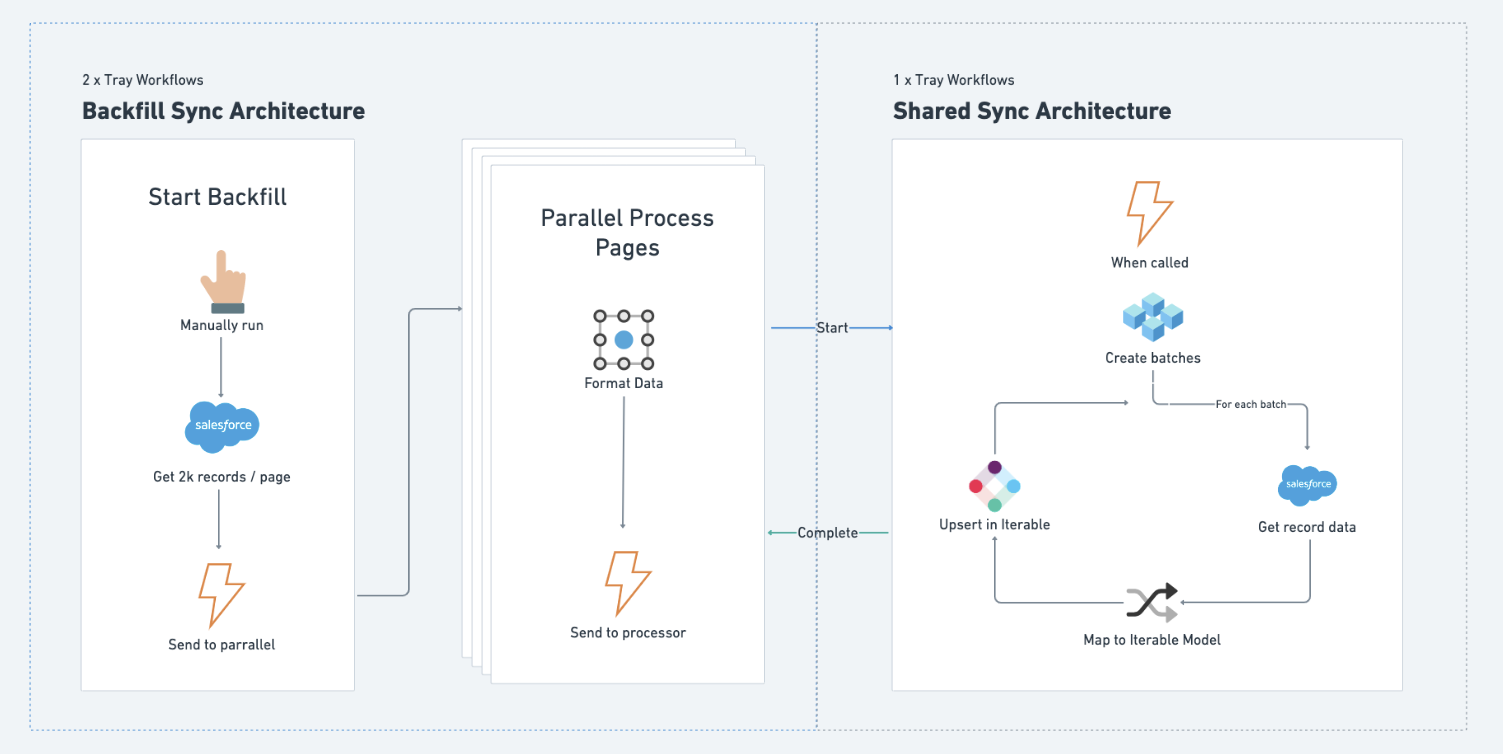 Now we’ve reached the point where both the real time and backfill processes have converged on the shared processing workflow by sending a list of records they want sync'd from Salesforce to Iterable.