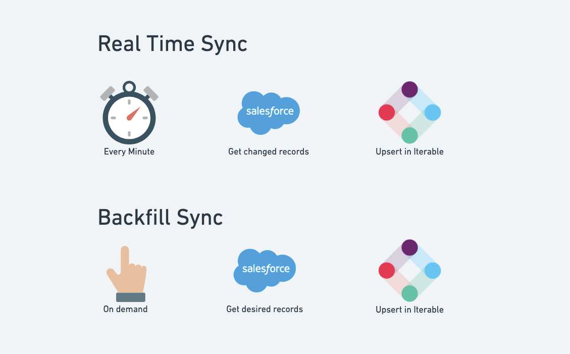 The solution provides a one-way real-time sync, pushing changes for the above Salesforce objects to Iterable every minute. It also provides an ability to run an initial or periodic backfill to get records pushed over in bulk: