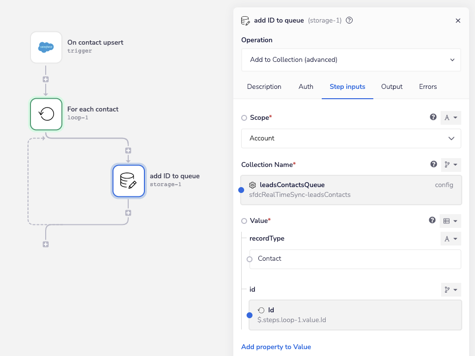 scope setting on the add ID to queue data storage helper means any data stored under the Collection Name sfdcRealTimeSync-leadsContacts