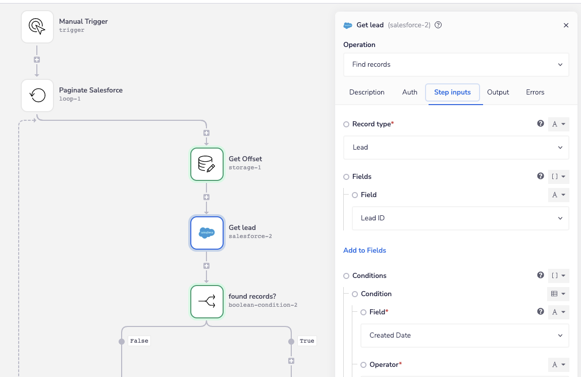 The basis for the first leg of our backfill process is the Salesforce Pagination template. The template allows us to query Salesforce for up to 2k records/page, looping each page of results until there are none remaining.