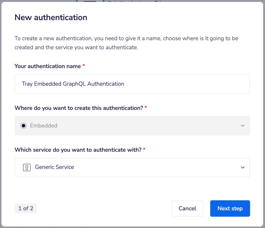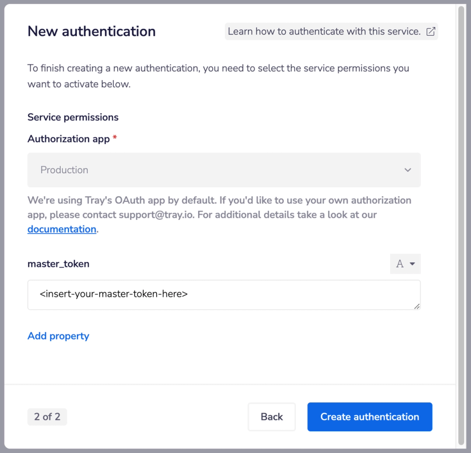 This authentication will house the master token needed to perform API calls against the Tray Embedded API.