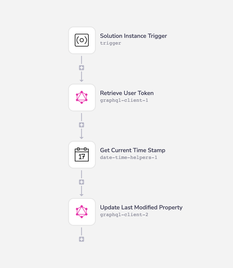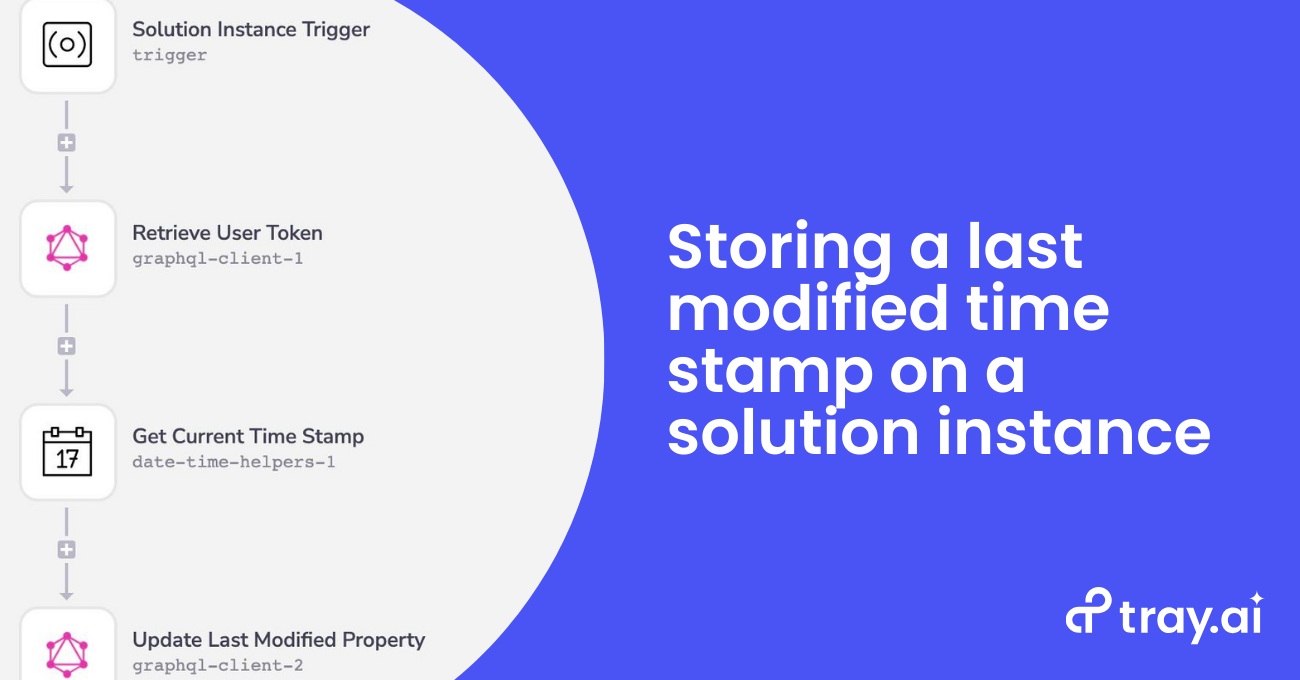 Tracking a last time modified time stamp and other various information on a solution instance when it is modified can be implemented through the use of a single workflow in Tray and the Tray Embedded API.