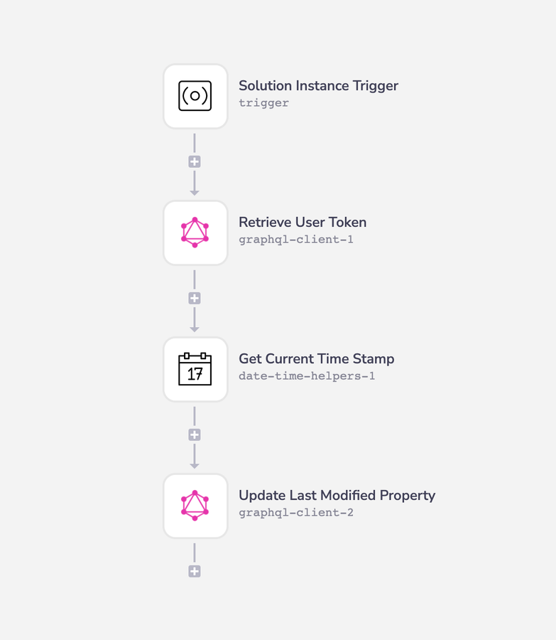 The workflow will consist of four steps: (1) Solution Instance Trigger, (2) Retrieve User Token, (3) Get Current Time Stamp, and (4) Update Last Modified Property.